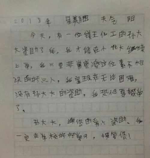 當(dāng)年8月份,紀(jì)某某和賈某某兩位學(xué)生分別以優(yōu)異的成績考入石家莊鐵道學(xué)院和河北工程技術(shù)學(xué)院。因家庭收入過低,無法支付昂貴的學(xué)費(fèi),家人一籌莫展,得知情況后,孫文董事長慷慨解囊,分別給予紀(jì)某某10000元、賈某某6000元的資助。受助家長激動(dòng)地說,真不知道怎么感謝董事長的恩情,兩位學(xué)生表示,一定不辜負(fù)孫文董事長的愛心和厚望,努力學(xué)習(xí),用優(yōu)異的成績回報(bào)社會(huì)。